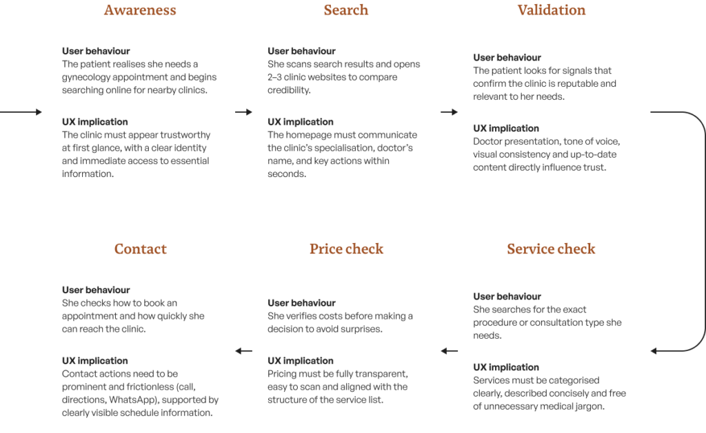 The primary insights came from structured discussions with the doctor, where I explored patient concerns, decision-making patterns and operational challenges specific to a small gynecology practice.