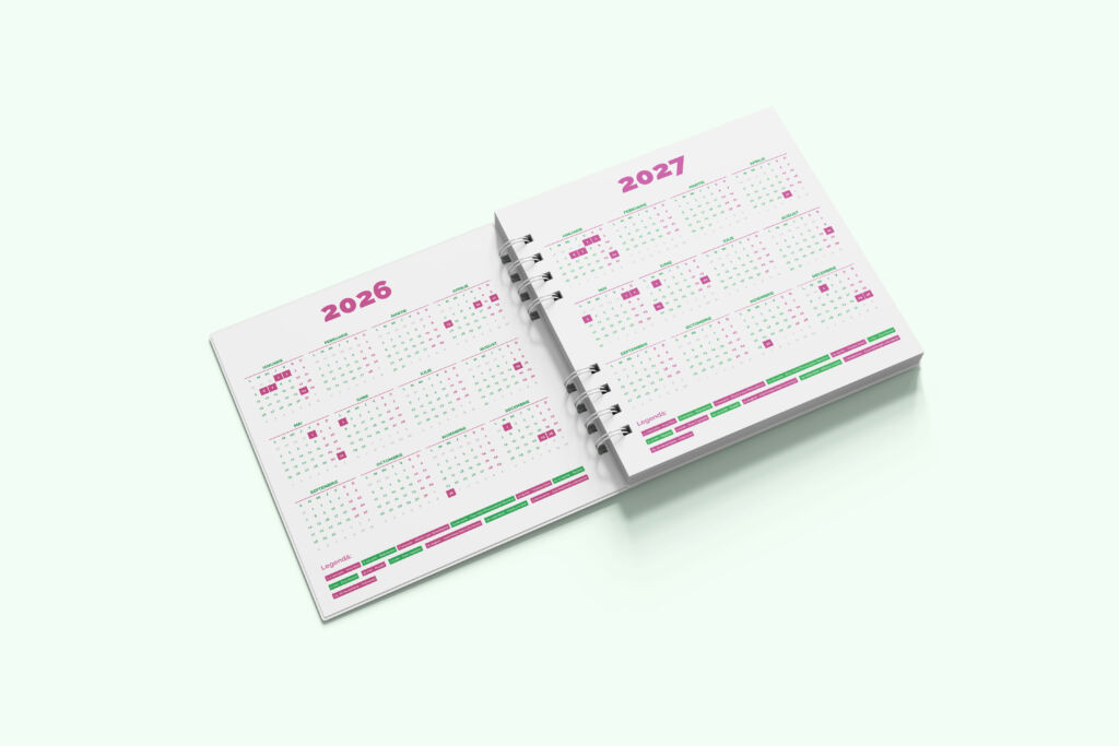 👉 Beyond the visual direction, the agenda required precise preparation for print production. This included establishing a coherent grid system, defining typographic hierarchy, adapting the layout across multiple page types and preparing all export files with accurate bleed, color profiles and print specifications.